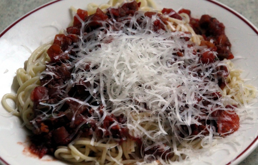 This week, when I made my middle-of-the-week trip home, I had a few minutes to breath, as my husband was working late.  I walked out to the back yard and had a nice visit with all of my flowers, which are in full bloom.  Dinner plate sized hibiscus, phlox, Rose-of-Sharon, Dianthus…then I took a turn in the pool.  Refreshed.  I love home.  So then I felt like I could do something a little different for dinner.  I had some sun dried tomatoes and was thinking on those when I remembered this one.  And I still had time to make it.  In not much more time than it takes to cook the pasta, you will have this sauce ready.   The way it is, it’s vegetarian.  Want gluten free?  Serve it with spaghetti squash.   Like most simple dishes, you can play with it.  It didn’t originally have fresh basil, but it sure was delicious in there.   You could add other herbs if you want.  Throw in a spoonful of pesto…yum.  Feel free to add cooked meat – pepperoni, sausage, chicken, beef, whatever.   It is fairly intense in tomato flavor, with the sun dried tomatoes, and that also helps make it thicker with very little cook time.  And when my husband says “don’t change anything “, I know it’s good.  That’s what he said about this one.